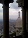 After doing some errands and taking care of a few business items, I was left with an afternoon stretching out in front of me. Unfortunately, by this time it was raining. Hard. I thought it might be a good day to go to the Louvre. When I got there, however, I realized that the entire population of continental Europe had the same idea. Apparently, every tourist decided the Louvre was the place to be.  Too crowded, too chaotic. I kept going. I decided to do some shopping, if only so my friend Heidi wouldn’t excoriate me for going to Paris and coming home empty handed.  I picked up a few items, and then I noticed that it had stopped raining. I turned and looked skyward to see the sun trying to break through the clouds. Steam was starting to rise from the pavement; the sun was starting to cast vague shadows. The clouds were breaking, the sky was turning clear blue. I knew where I needed to head: Sacre Coeur.