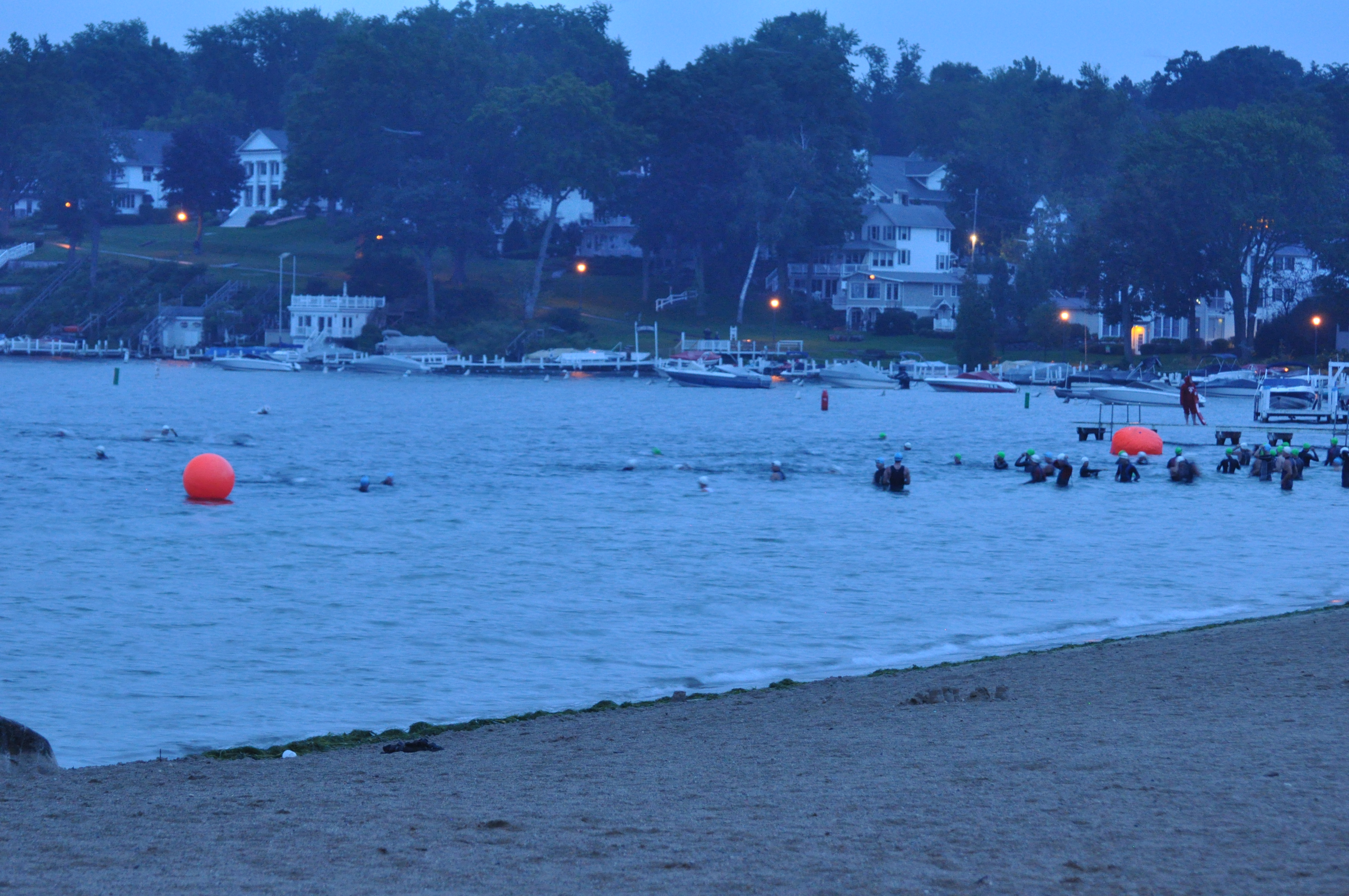 I looked anxiously at the sky which was slowly becoming tinged with a cold blue light. There were ominous clouds, but no thunder or lightning. My greatest fear was that all or part of the race would be canceled and all my months of meticulous training would go to waste. Finally the race director announced, much to my relief, that the race would take place in its entirety, in spite of the weather. I breathed a sigh of relief and made my way down the beach for my pre-race swim.