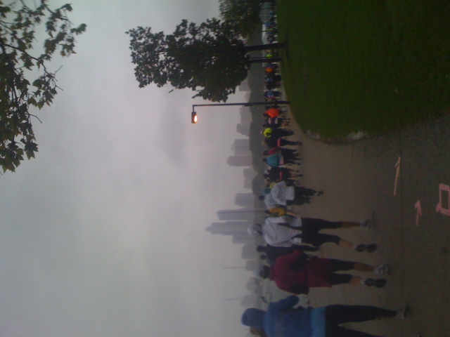 The weather put a damper on the pre-race buzz. Instead of cheering and whooping while waiting for the start, runners stood huddled together, pulling their hats low over their eyes. Several people had covered themselves in plastic garbage bags in order to stay dry. I wished I’d thought of that.